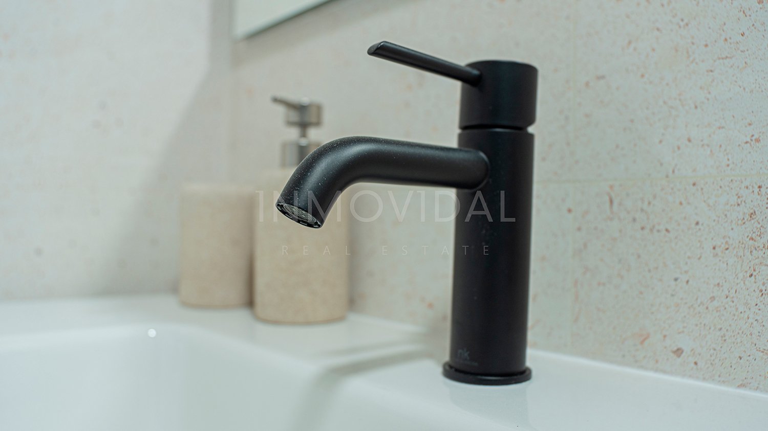 Baños de diseño con grifería negra mate y platos de ducha extraplanos.